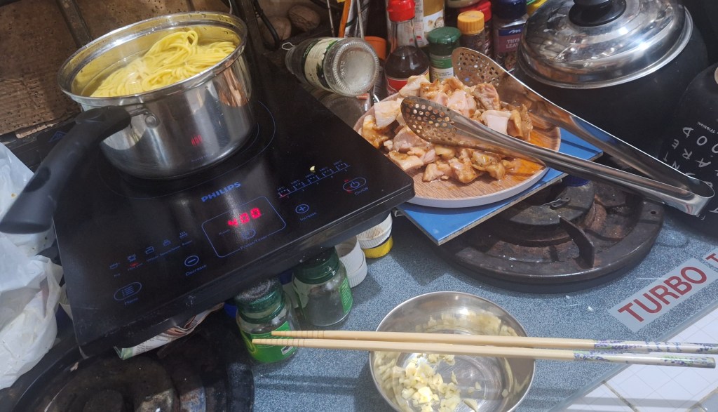 shallow fry the chicken for 10 minutes till done. Cool and slice into cubes.